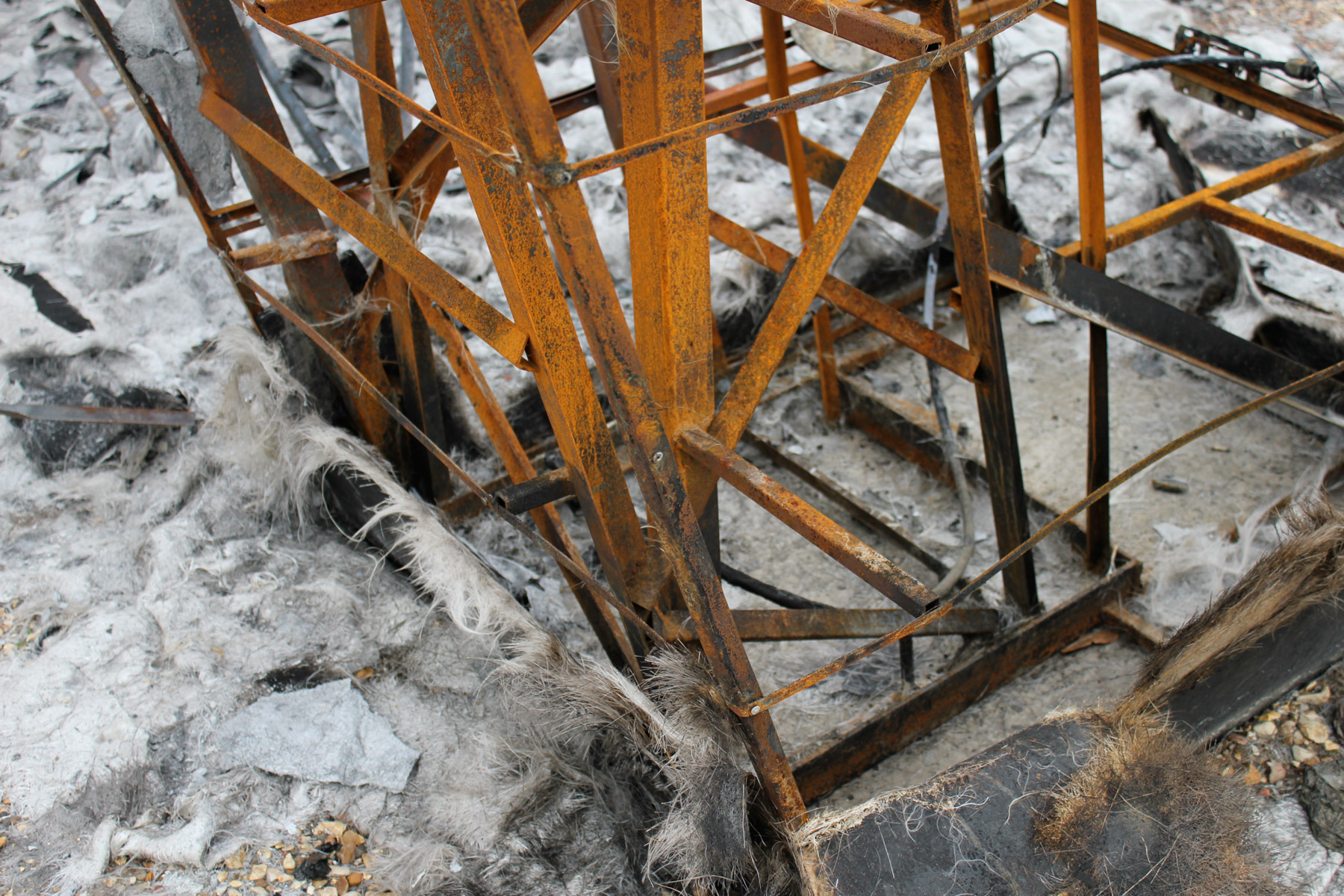 In July 2010, the massive form was unveiled to the public on Southsea Common in Portsmouth. It lit up at night, illuminating seats beneath the beast’s belly; a small gesture suggesting shelter, a place to gather. The intention was for the sculpture to make its way to two other locations in the UK: Colchester’s Lower Castle Park and a derelict site in Cardiff Bay. However, in October 2010, the structure suddenly burned down in an unexplained fire. At first, arson was suspected; later, investigators believed that it was caused by water getting into the sculpture’s electrics. Whatever the cause, all that was left of the dinosaur was a rusting metal frame.
