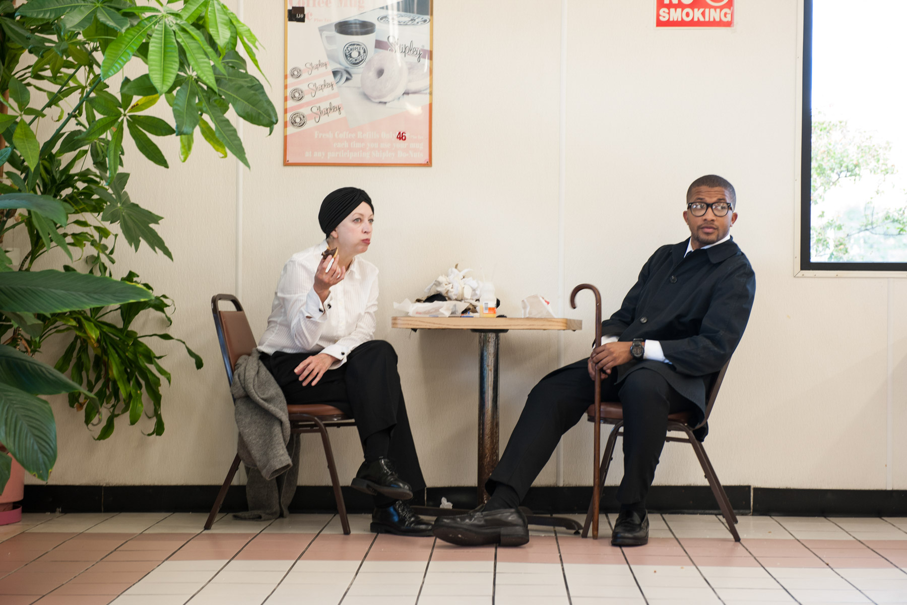 Slyk’s psychological turmoil permeates the gallery space, a dark and dramatic refuge where fragmented clues to Slyk’s past surface through objects, actions, and soliloquies. Here, Slyk wrestles with her traumatic history as she rehearses the re-invented self she presents to the outside world—an odd music hall entertainer in the style of Charlie Chaplin’s Calvero. In accordance with the duality that underscores the entire play, Sancho counters Slyk in nearly every way—he remains outside the gallery at all times and opposes Slyk in appearance, demeanor, symbolism, and connection to reality. Inspired by the character of Don Quixote’s servant in Cervantes’ famous novel, he is Slyk’s trusted sidekick and fearless protector. Sancho shares Slyk’s strict adherence to an internal code of conduct, but follows his own eccentric set of rules in an effort to make amends for his past shortcomings. He consciously resides physically and psychically outside his master’s world, but the intensifying allure of her delusional enchantment becomes increasingly hard to resist. When Slyk exits the gallery and enters Sancho’s realm, the odd couple falls back into place and resumes their act in the streets of the city, like a modern day Laurel and Hardy off to change the world.